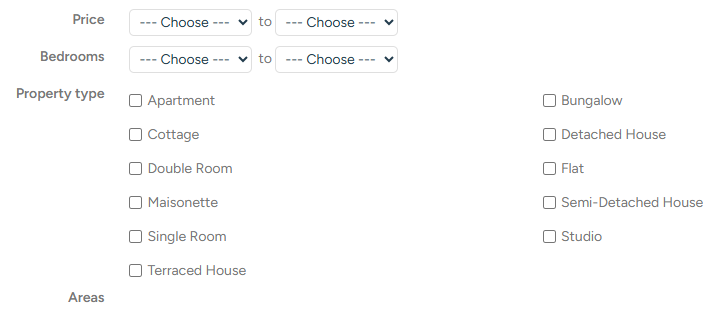 These areas will then be available to select against both properties, under the address details and against applicants search criteria via the tenant or buyer pages as per the below.  We recommend that when adding a property you select one area that best matches its location; when adding search criteria for applicants you can tick as many different areas as required.  The searches will then filter out properties based on the matching search areas, whilst avoiding typos or slight mismatches in areas between the two.
