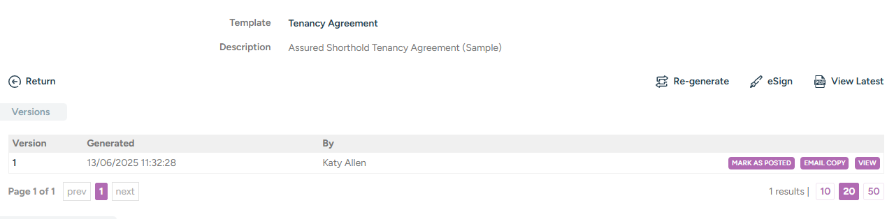 First, simply generate the document as you would normally, in this case via the Letting > Documents menu. When you generate a document with eSigning tags in it you will see a new 'eSign' option on the following page as per the below: