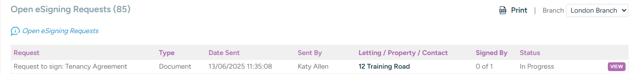 Once the first party has signed the document it is emailed onto the next party in the list and the process repeats. Your 10ninety system is automatically updated to keep track of progress, and there is a new alert (under General Alerts > Open eSigning Requests) showing any open requests: