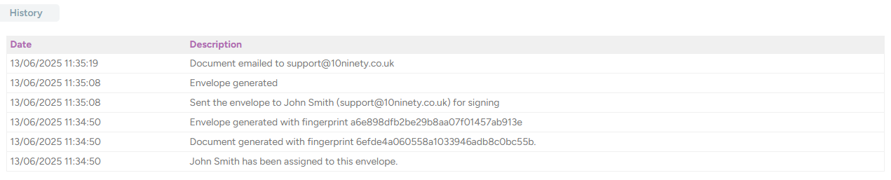 Once all parties have signed the document everyone will receive an email notifying them that the the process is complete and containing a copy of the document itself. We also automatically upload it back into your 10ninety system where it is stored along with a digital proof of the signatures (in the form of a digital fingerprint and audit trail attached as an additional final page to the document) as the latest version of the document. You can see an example of this in the attached file.