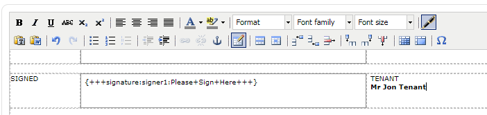 In some cases you may wish to generate and print the document for signing in the old fashioned way. You will notice if you print the document there will be strange text where the signatures would normally go, something like "{+++signature:signer1:Please+Sign+Here+++}". To generate the document for printing without these simply edit the document and click the new fountain pen signature