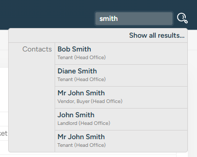 A maximum of 5 results are returned per category (contacts, properties and lettings) in this dropdown so if you don't see the match you are looking for then hit Return or click on the magnifying glass icon and you will be taken to a page with all of the search results. You can switch between category using the links on the right.