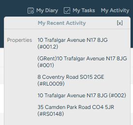 A very useful way of navigating between things that you have been looking at is using the My Activity widget at the very top of the system. Click on the link and a dropdown is displayed with the last 5 contacts, properties and lettings that you have been looking at.