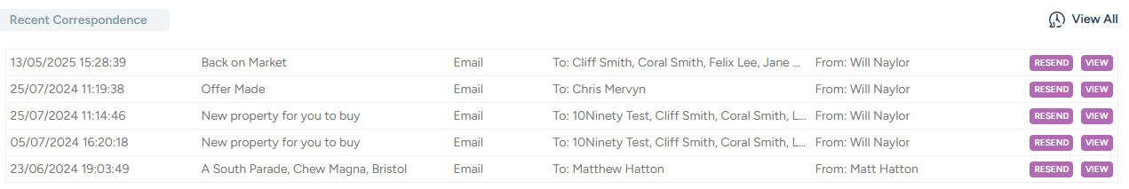 The system keeps track of all correspondence sent from it - emails, SMS messages and letters. To view the correspondence history for a given contact, property or letting, click on the "Letters & Emails" side-menu link. The most recent correspondence is shown, together with a "View All" link to show the full history: