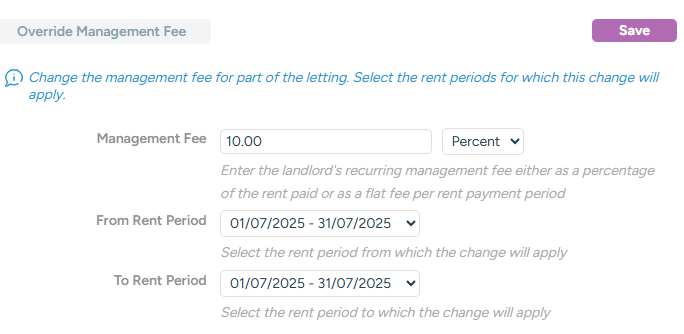 Normally, the same management fee will be used through-out a tenancy. However, it is possible to override this and have different fees for different rental periods.