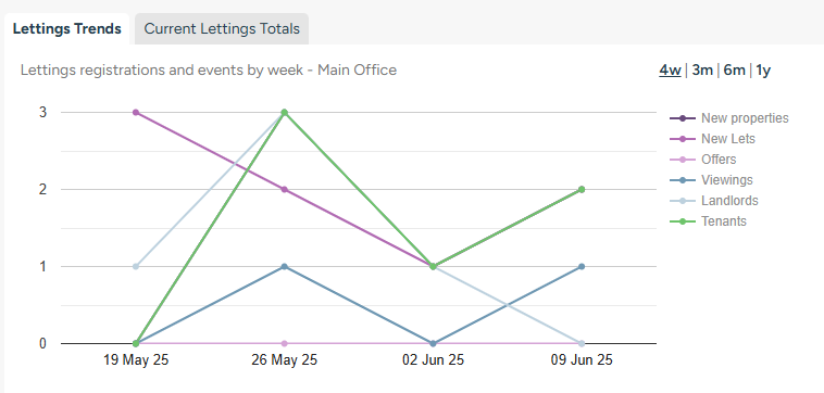- Sales and Lettings trends and statistics (for example, how many viewings there were in the last month):