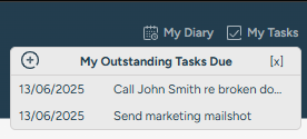 The system contains a task management feature, allowing you to log and track tasks that either you or other members of staff need to follow-up on (e.g. callbacks).