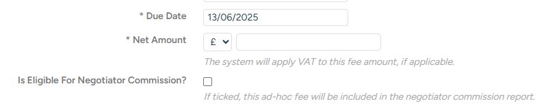 Commission will just be applied to the letting fee by default, but it can also be applied to any ad-hoc fee too, by ticking the "Is Eligible for negotiator commission" tickbox on the fee: