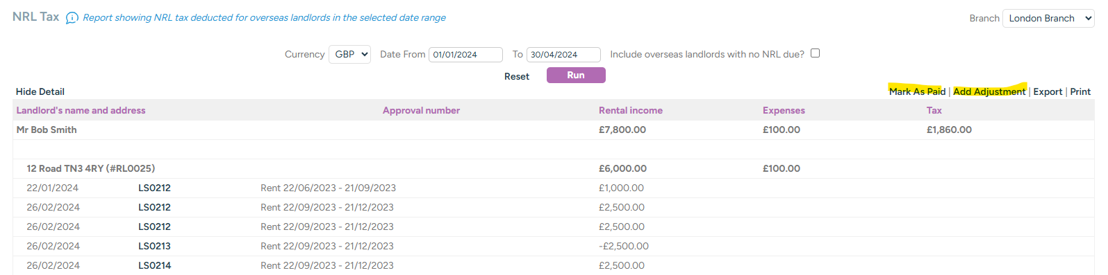 The NRL tax you have deducted can then be marked as paid to HMRC from the report by clicking Mark As Paid, or add any adjustments i.e. a refund to the landlord of tax previously deducted, or a receipt of additional tax by clicking Add Adjustment.