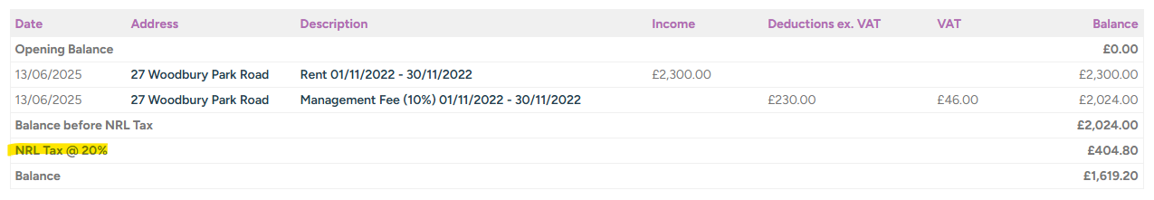 The NRL tax deduction will appear on the landlord statement at the bottom: