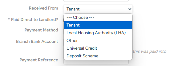 Go to the Letting>Tenant Receipts from the ‘Letting Menu’ on the right. Click ‘Add’ and enter the amount you will be passing to the Landlord from the deposit held at the Protection Scheme.