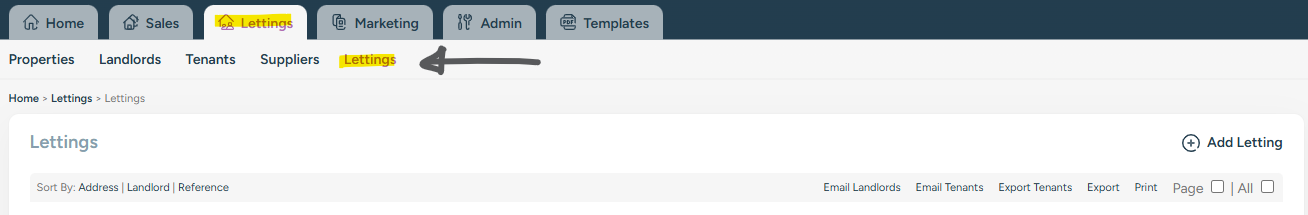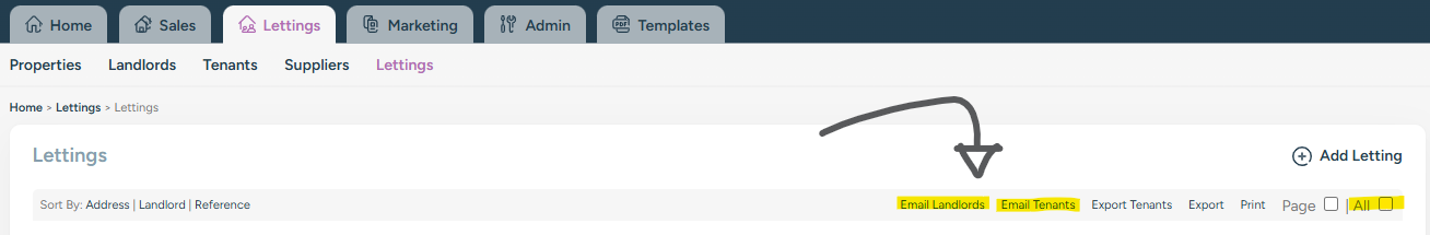 To send the email, go to Lettings then click Lettings again from the blue sub-menu. Here you have a list of all your currently active tenancies, you can optionally filter them using the 'Search' box on the right. Once you're ready to send the email, tick each letting individually or, select all by ticking the 'All' checkbox in the top-right hand corner.