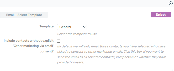 This will prompt you to choose which email template you'd like to send, if you want to type out a brand new email, just leave this selected as 'General'. We will also ask you whether you'd like to include recipients who haven't explicitly given you their marketing consent. If you want to send this email out regardless of GDPR settings, tick the box.