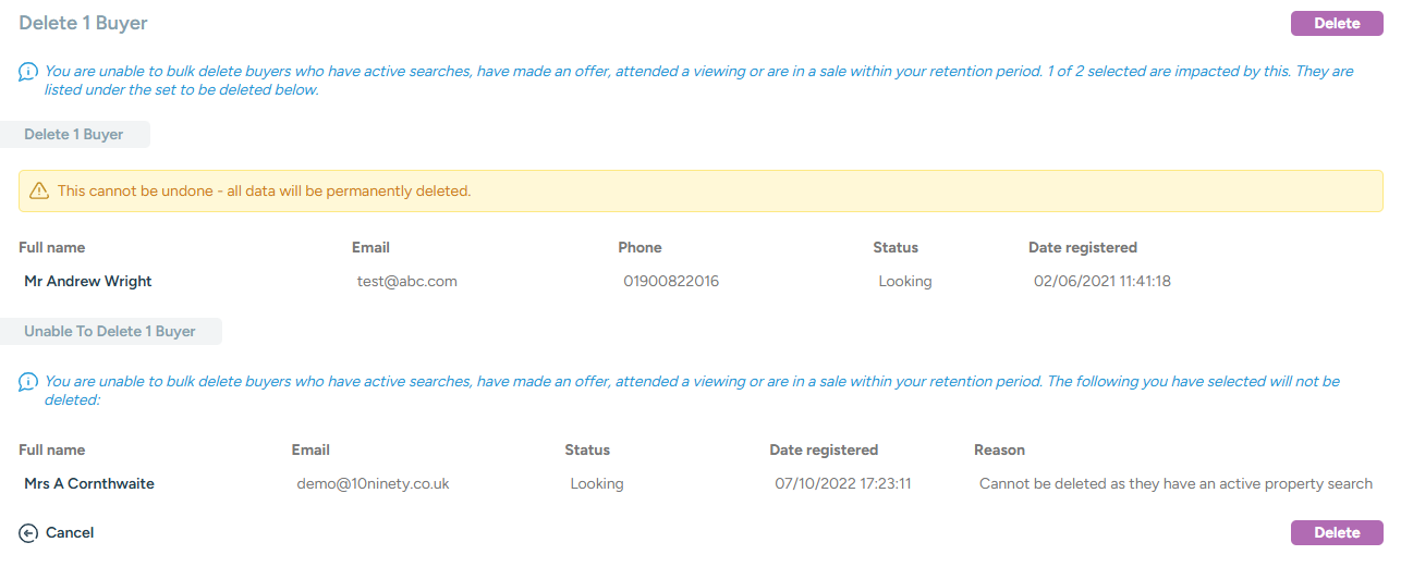- Buyers (default 6 months) - You will not be able to bulk delete a buyer who has registered with you within this period. You will also not be able to bulk delete any buyer who has an active property search (status of looking and a search 'Valid Until' date in the future)