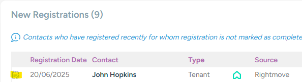 Leads from Rightmove, Zoopla, OnTheMarket and your 10ninety website will appear in the 'New Registrations' alert under your 'Marketing Alerts'.