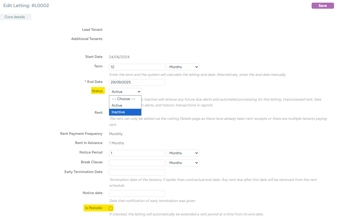 If the Letting was previously Periodic, ensure you untick the 'Is Periodic tick box.