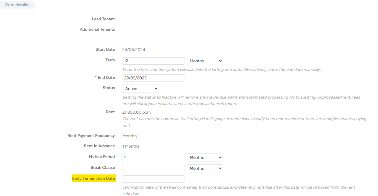 If the Letting was terminated early, you can denote this by setting the date the Tenant moved out in the 'Early Termination Date' field in the 'Letting Details'. This will shorten the Rent Schedule as appropriate and will flag any balances the Tenant is due to pay, or the Tenant is due to be refunded as a result of the early termination.