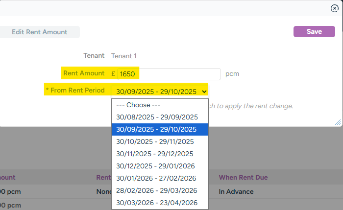 In the pop-up window that appears, set the desired increased rent amount and then select from which Rent Period you wish for the increase to take effect from.