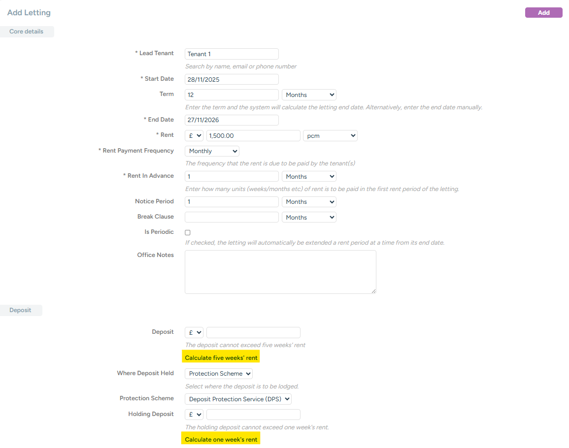 The very first thing to do is to setup the letting. This allows you to record the Deposit for the tenancy, alongside any Holding Deposits. The system even has the option to calculate the maximum deposit amount allowed for the tenancy, as well as the option to calculate the Holding Deposit at the click of a button.