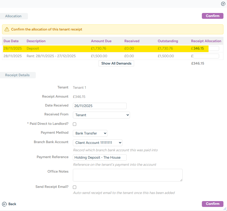 Once the Tenant(s) have paid the Holding Deposit, you can record this in the system by adding a Tenant Receipt. They system will automatically allocate this payment to the Deposit demand that you created in Step 1.