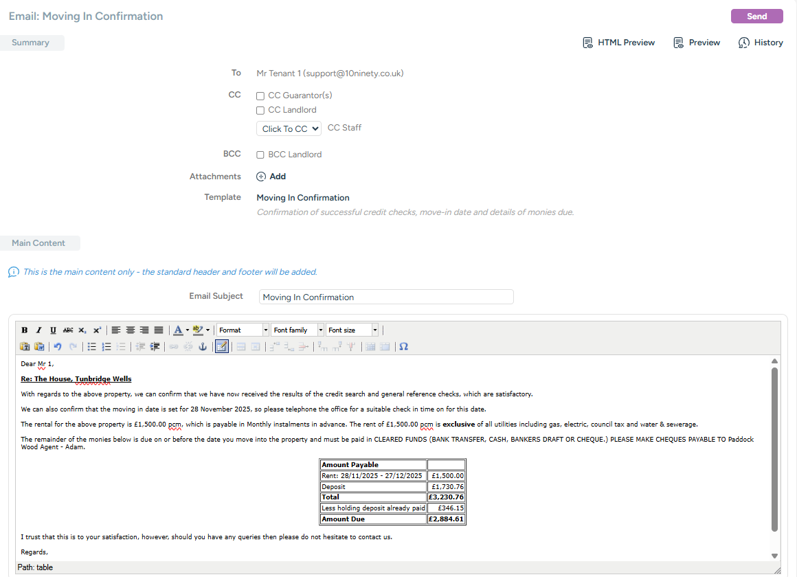 The system has a built-in template for this that can be found by going to Letters & Emails -> To Tenant -> Moving In Confirmation. You also have the option to CC and additional Tenants or the Landlord into this communication if you wish.