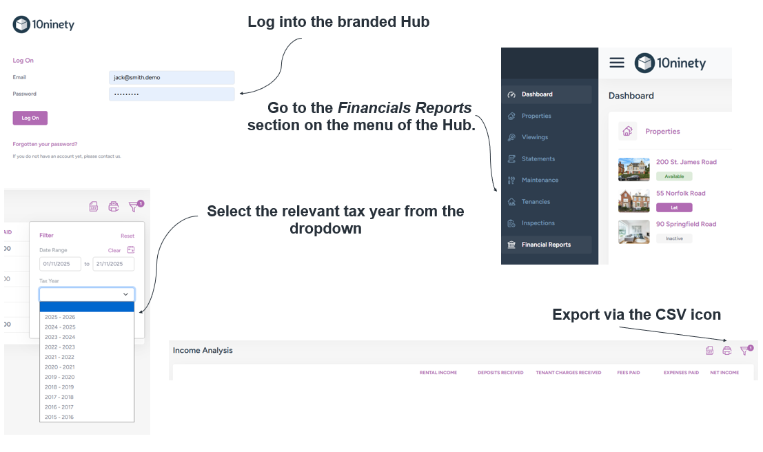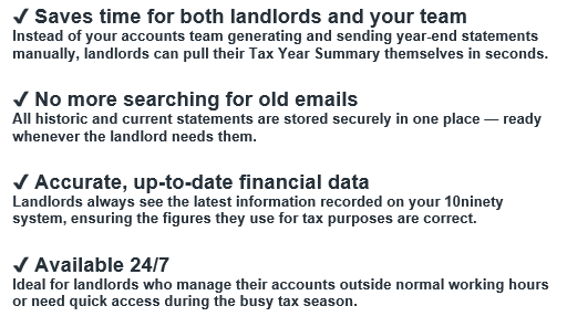 One of the most valuable features is the ability for landlords to download their own Tax Year Summary without having to request it from your accounts team. This significantly reduces time spent responding to year-end queries and gives landlords exactly what they need for HMRC or their accountant whenever they want it.