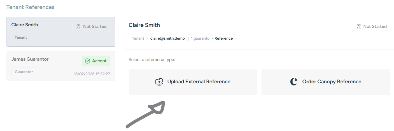 No problem! You would click 'Upload External Reference' on the 'Tenant Referencing' tab > upload the report and update the result once you have it: