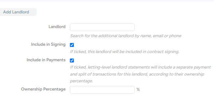 2. to include the additional landlord in landlord statements based on their percentage of ownership i.e. 50-50% split or 70-30% split.